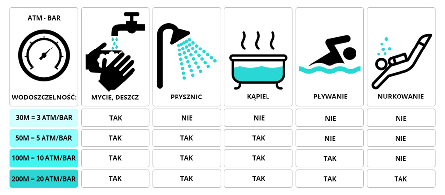 - 50 m = WR50 = 5 ATM = 5 Bar – modele o takiej szczelności pozwalają na krótkotrwały kontakt z wodą, np. podczas kąpieli w wannie, jednak nie nadają się do pływania.